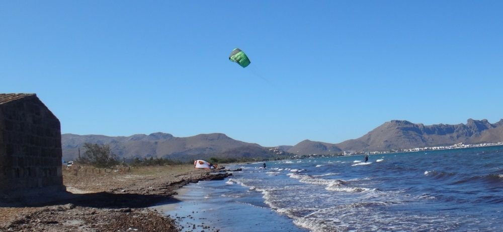 And there I was, relaxed … resting, sitting on the beach after our kite lessons, when I see this strutless Airush tube kite with his kiter under it, presumably riding towards Puerto Pollensa.