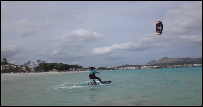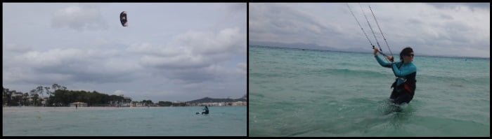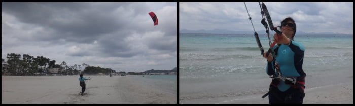 In einem fast leeren Strand von Alcudia beginnt Denise ihren Kite-Kurs und nach ein paar Stunden Training mit verschiedenen Grössen beginnt sie mit ihren ersten Bodydrags